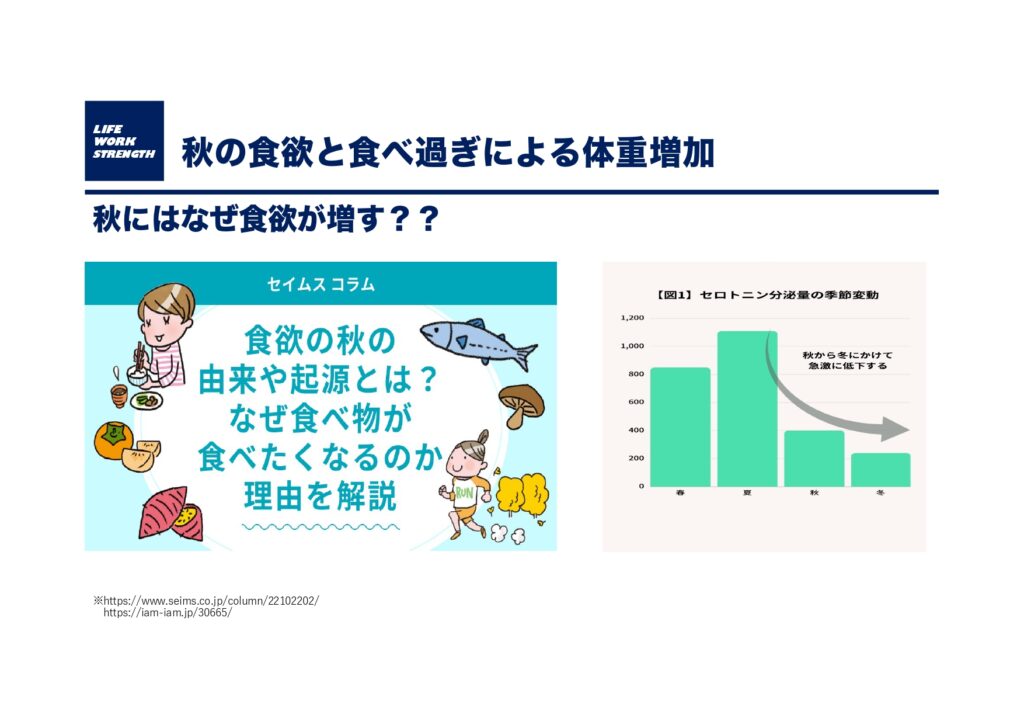 秋には、日照時間が短いので分泌量が夏に比べると落ちます。そのため、食欲を抑制する働きが少なくなり、食べてしまい、体重増加に繋がってしまいます。