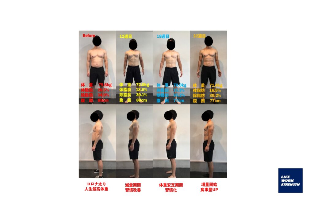 トレーニングプログラムの成果は、体重の-10kg減量に成功、運動は週に2~3回以上が定着しました。