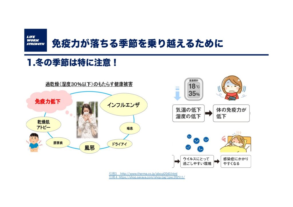 ・冬は空気が乾燥しやすく、自然免疫の粘膜なども乾燥しウイルスが活性化する「低音乾燥」と呼ばれる条件が揃い、免疫が落ちてしまいます。