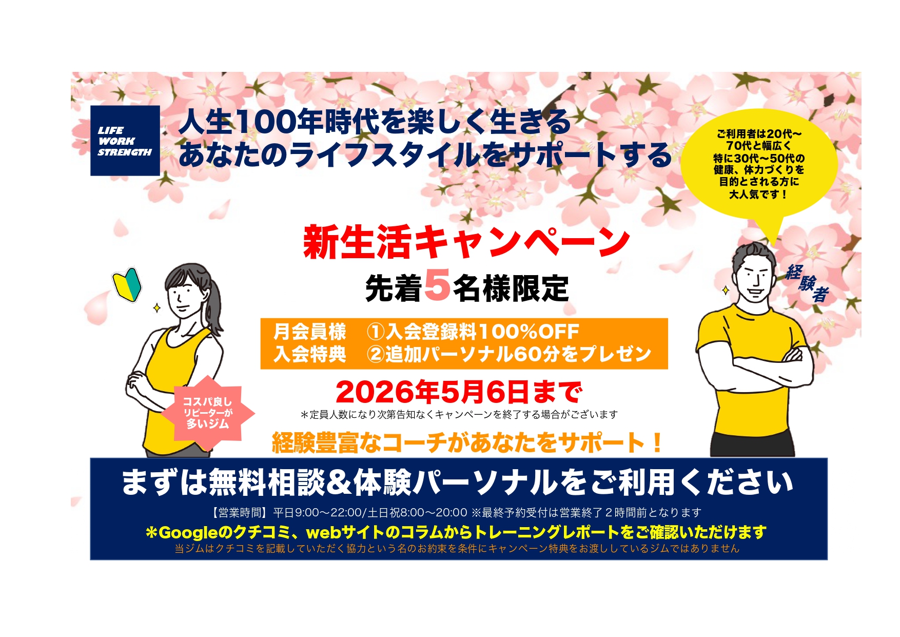 先着5名様に月会員入会されると、今だけ入会登録料¥0と追加パーソナル60分✖️1回分をプレゼントいたします。
