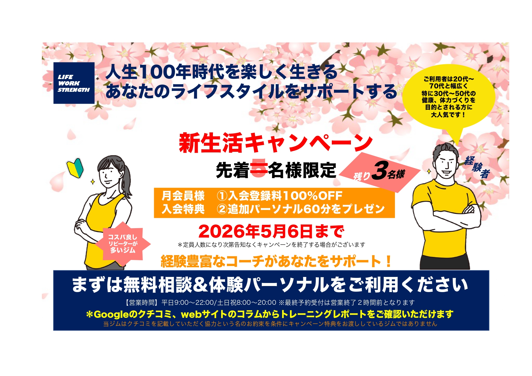 先着5名様に月会員入会されると、今だけ入会登録料¥0と追加パーソナル60分✖️1回分をプレゼントいたします。